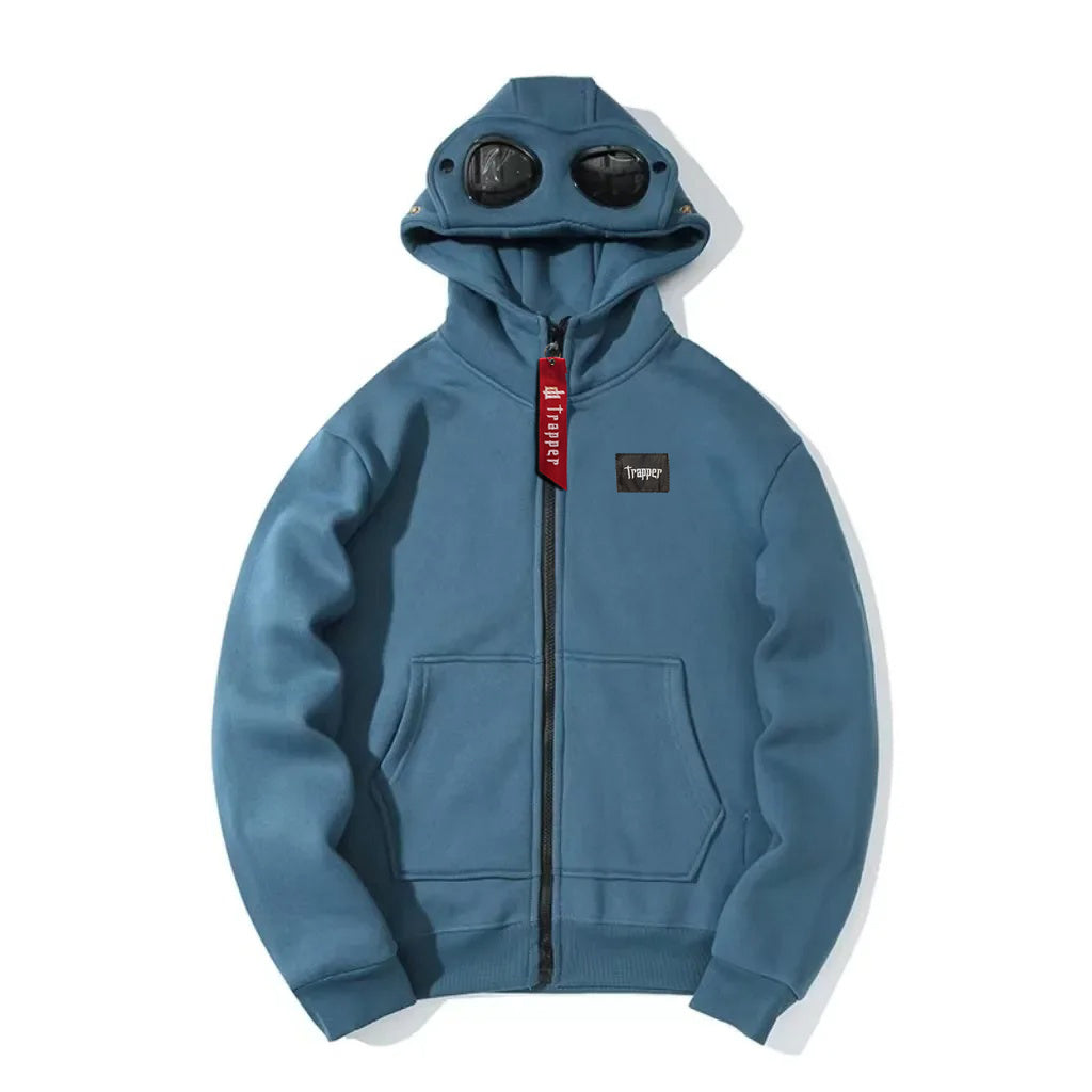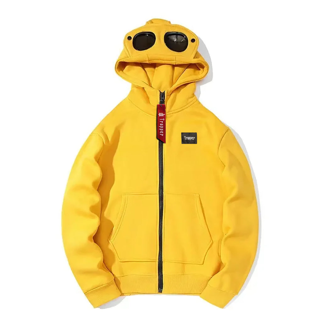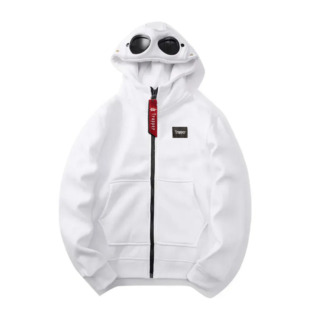 Felpa dal design moderno e urbano che si distingue per la cappuccio con occhiali da sole integrati nella parte frontale, offrendo uno stile unico, audace e funzionale. Pensata per chi cerca di distinguersi senza rinunciare al comfort, è perfetta per un look streetwear con personalità propria.